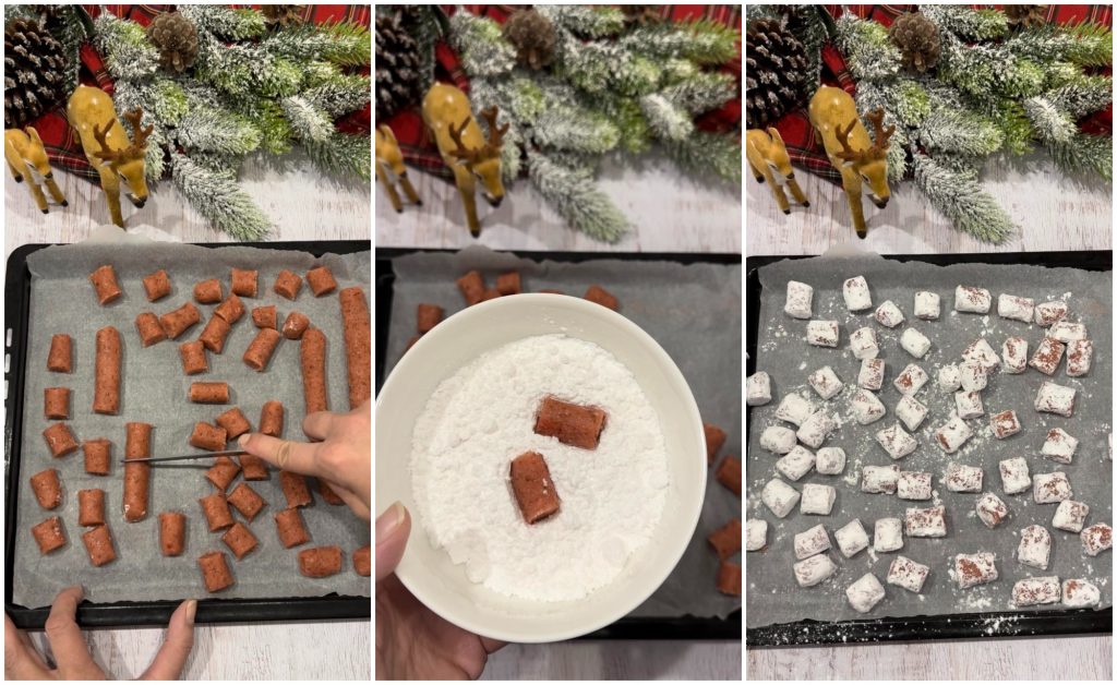 • Coloque os rolinhos de pasta de amêndoas em uma assadeira polvilhada com açúcar de confeiteiro e coloque no congelador por uma hora.