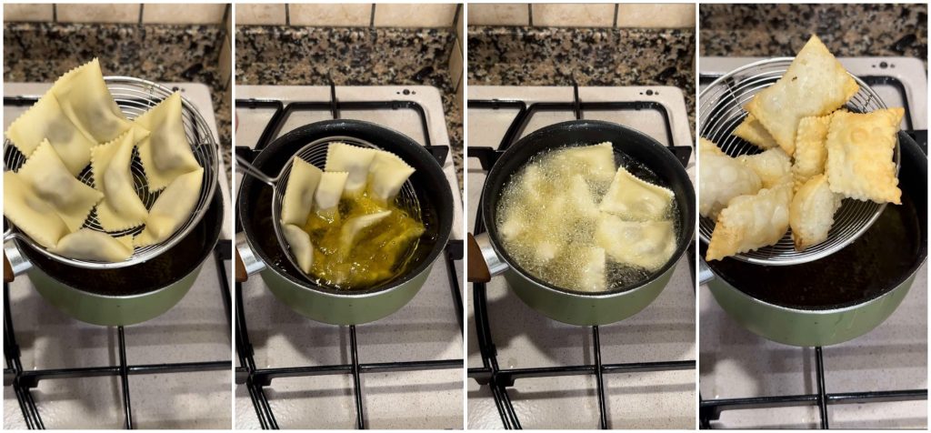 Um truque esperto para mergulhar os caggiunitt todos juntos sem espirrar o óleo: pegue a espumadeira e coloque os raviolis dentro até cobrir a superfície (lembre-se sempre de não exagerar com o número de raviolis a serem cozidos por vez).