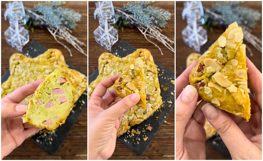 A torta salgada macia de Natal pode ser recheada de mil maneiras! Na versão vegetariana usando apenas legumes, frutas secas e queijos. Eu coloquei na massa pesto de manjericão, presunto cozido e muito, muito queijo.