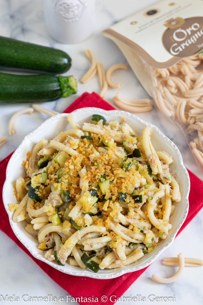 Todo mundo à mesa! Hoje o cardápio inclui pasta com abobrinha e atum com migalhas de pão torrado! Um primeiro prato realmente simples, rápido de preparar, até mesmo ótimo morno ou frio (especialmente no verão!). A pasta com atum e abobrinha é um daqueles primeiros pratos de sabor delicado e delicioso! Quem não gosta de abobrinha poderá substituí-la pela verdura da estação que preferir, assim poderá preparar esta receita sempre que quiser! Este prato é realmente saboroso e bem equilibrado e pode ser consumido até mesmo por quem está de dieta. Para uma versão vegetariana, podemos omitir o atum. Vamos ver juntos como se prepara a pasta com abobrinha, atum e migalha de pão torrada!