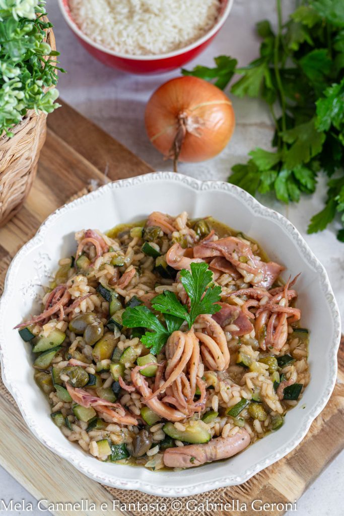 • Neste ponto, adicione as abobrinhas com azeitonas e alcaparras, depois as lulas e termine de cozinhar o arroz.