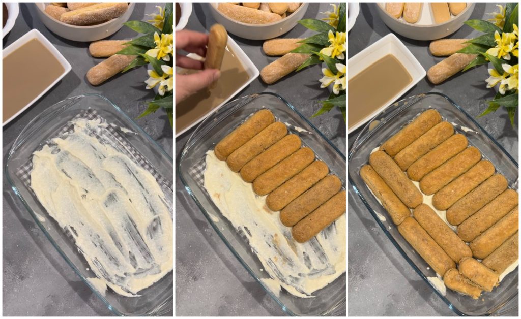 “Espalhe levemente o fundo com um pouco do creme e depois faça a primeira camada de savoiardi levemente molhados no café e leite.