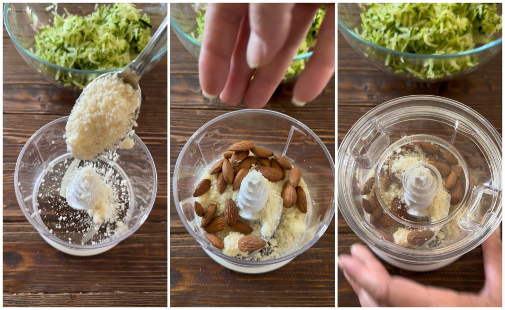 • Agora, pegue um triturador, coloque o parmesão ralado e as amêndoas.