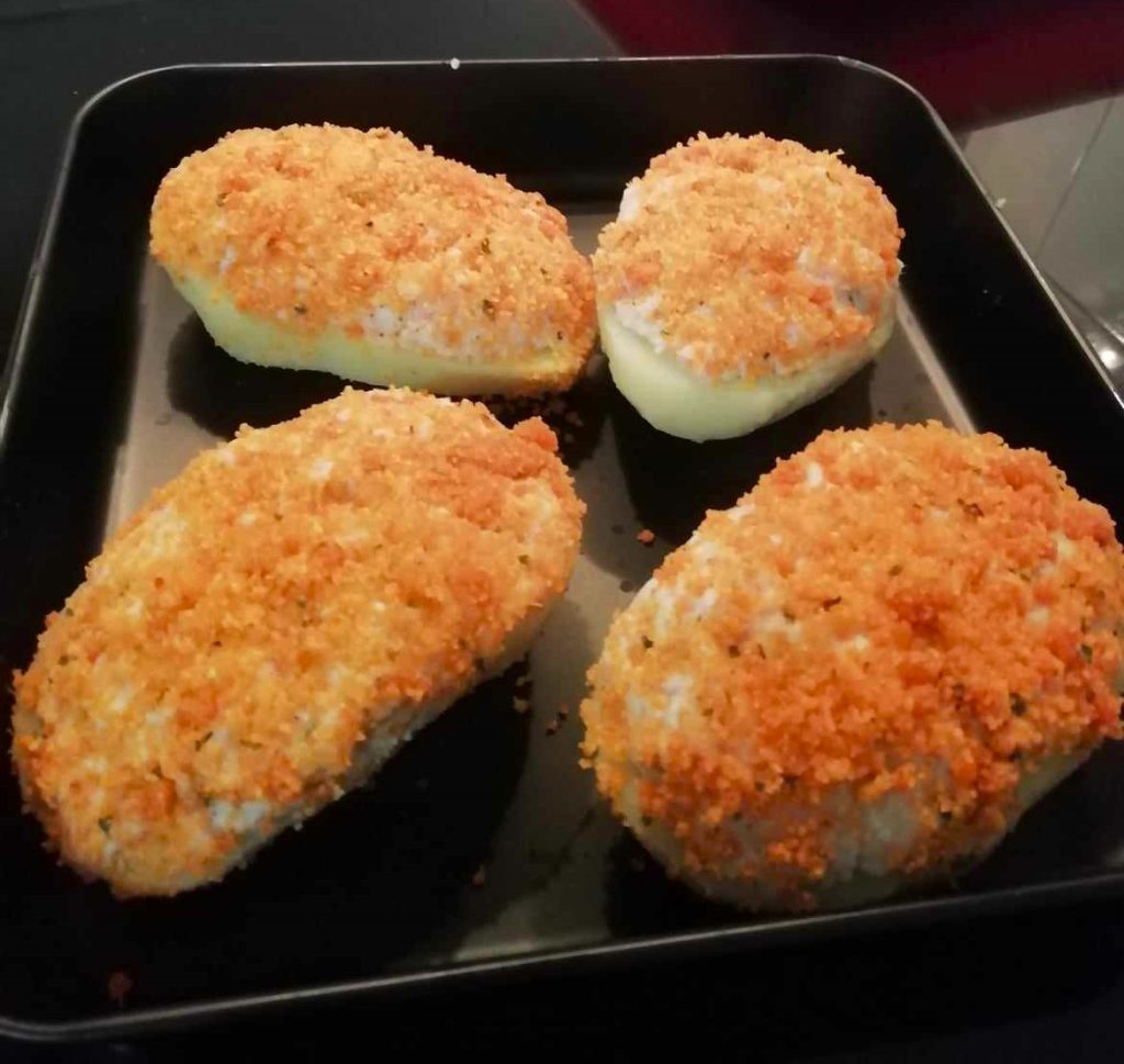 Nesta receita, a crosta crocante foi feita com pão ralado aromatizado que costumo usar para os mexilhões gratinados, uma verdadeira delícia de sabor, que você pode acompanhar com as batatas recheadas no seu buffet de festas ou em qualquer ocasião.