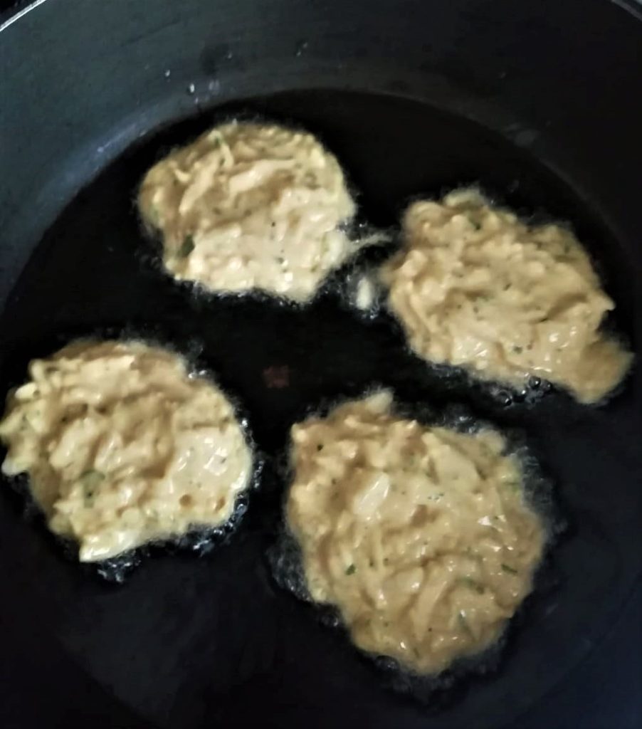 Em uma frigideira grande coloque um pouco de óleo e deixe aquecer. Os bolinhos não precisam boiar no óleo, use pouca quantidade.