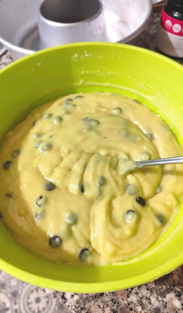 Por último, adicione à massa o chocolate amargo picado em pedacinhos ou as gotas de chocolate, que são mais práticas.