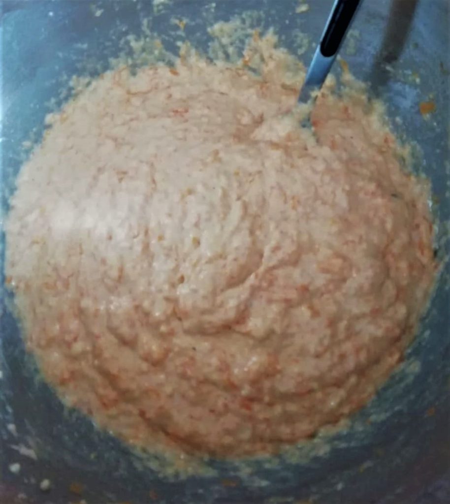 Despeje o creme de abóbora em uma tigela grande, adicione a água e misture, depois junte a farinha e o fermento. Misture bem a massa. Finalmente, incorpore à massa a mistura de tofu com os tomates e especiarias e adicione uma última pitada de sal.