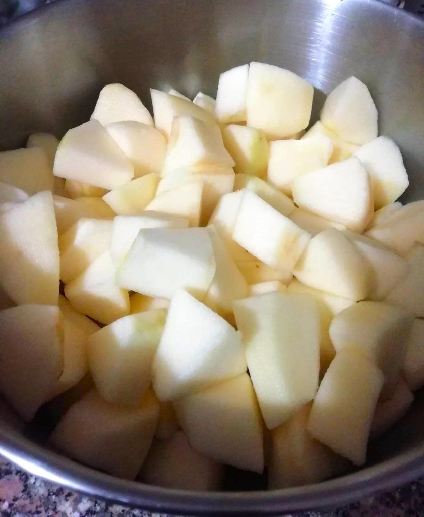 Descasque as maçãs e corte em pedaços não muito pequenos, 2-3 cm está bom. Coloque-as em uma tigela grande, esprema o suco do limão por cima para não escurecerem e passe para a próxima etapa.