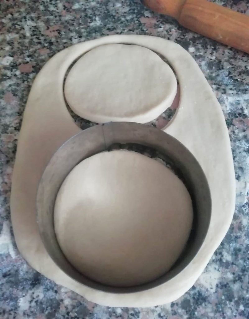 Pegue a massa fermentada e divida em 6 partes iguais. Enquanto prepara as brioches, mantenha os pedaços de massa cobertos, para que não sequem na superfície. Abra um pedaço com o rolo, depois com um cortador de massa de 10 cm de diâmetro, corte 2 discos iguais.