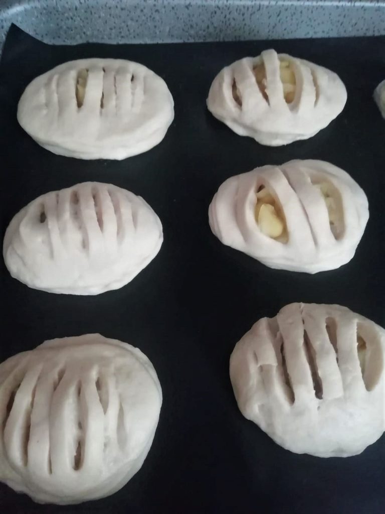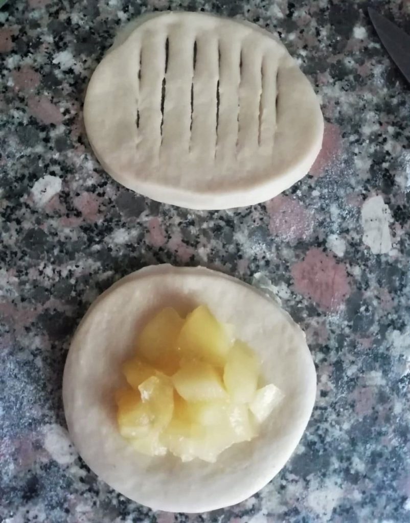 Em um disco de massa coloque 2 colheres de chá de maçã e pincele a borda com água. No outro disco faça cortes no centro com uma faca afiada, 8-9 cortes serão suficientes. Sobreponha o disco com cortes sobre o disco com as maçãs, sele as bordas e coloque as brioches prontas em uma assadeira.