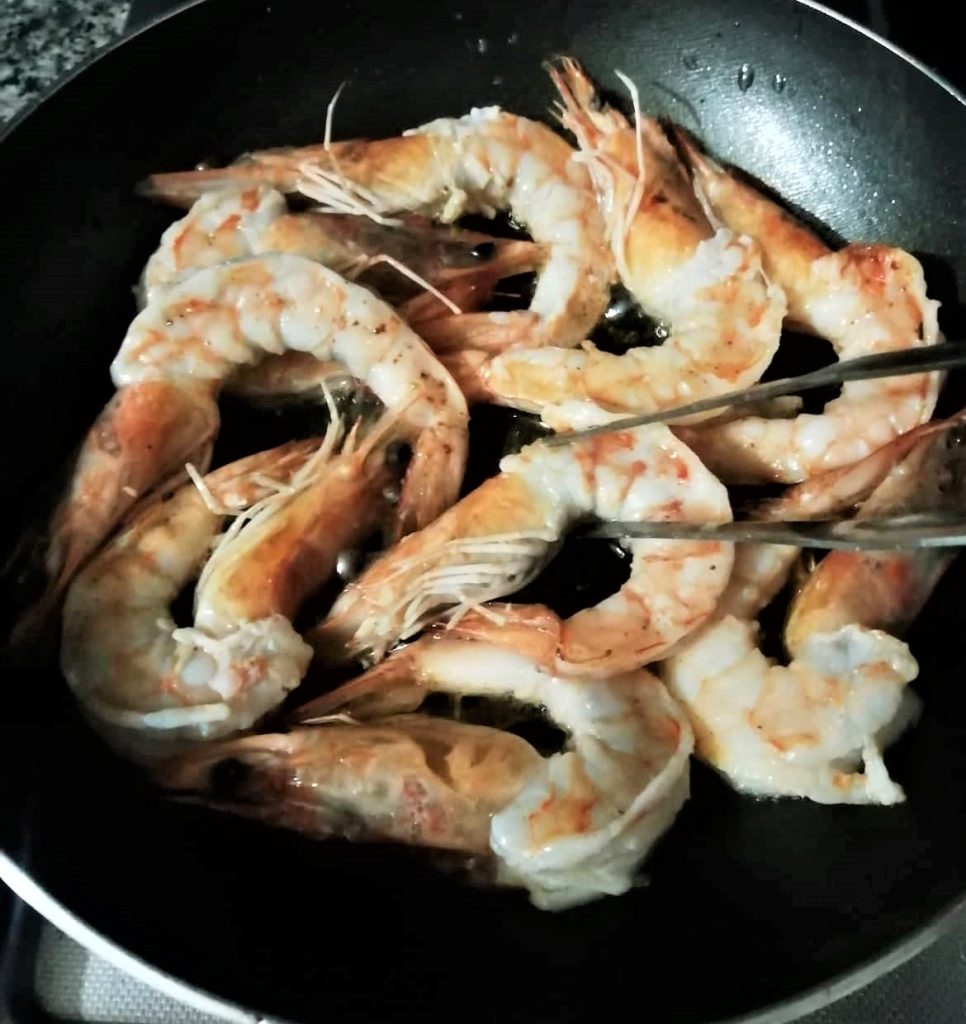 • Em uma frigideira antiaderente, coloque um fio de azeite e sele os camarões por 1 minuto.