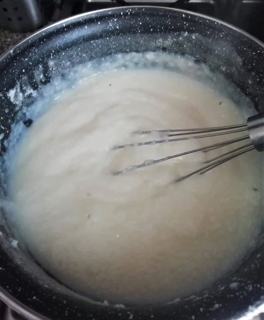Agora adicione todo o leite restante, misture bem o composto e coloque-o de volta na panela no fogo.