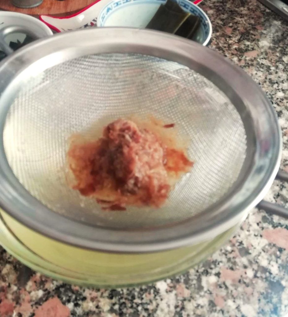 Quando a água começar a ferver, remova imediatamente a alga kombu. Não descarte, reserve na geladeira ou congele, você pode fazer uma receita simples para acompanhar arroz branco chamada Kombu Tsukudani (em breve colocarei a receita).