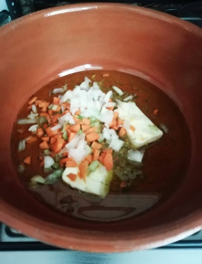 • Em uma panela grande, de preferência de barro, prepare o refogado colocando o azeite e a manteiga, a cenoura, o salsão, a cebola picados e o dente de alho inteiro.