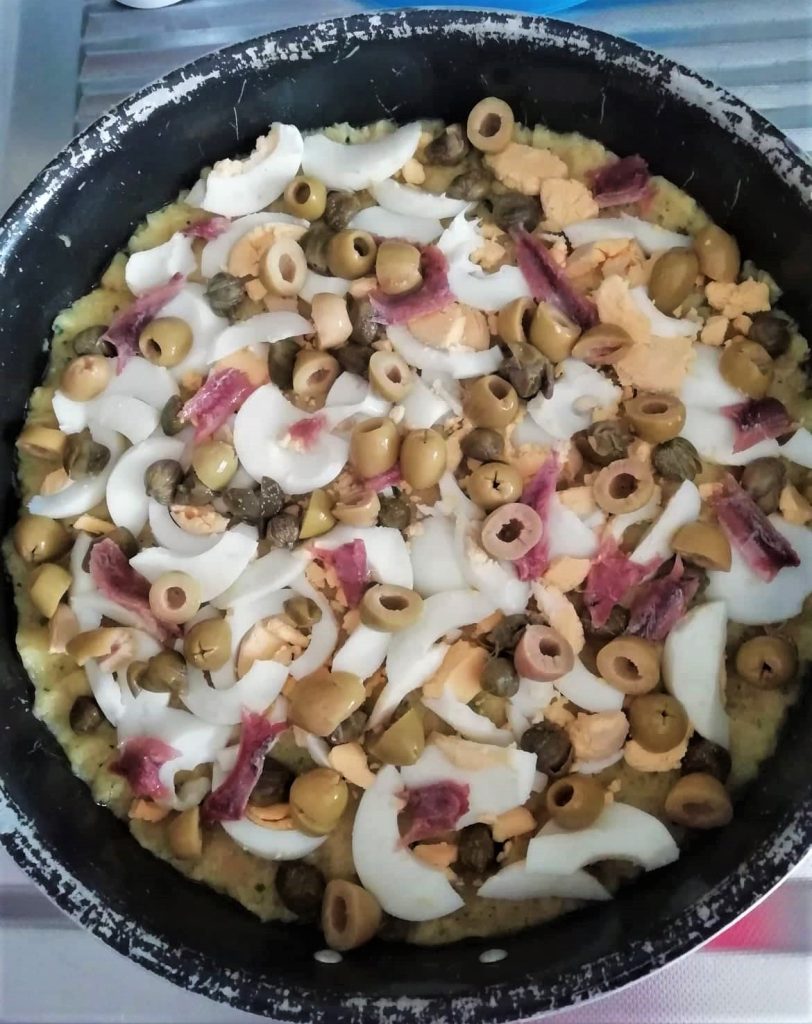 • Recheie a focaccia com os ovos cozidos cortados em fatias, e depois camadas de alcaparras, azeitonas cortadas em fatias ou inteiras, e filetes de anchovas.