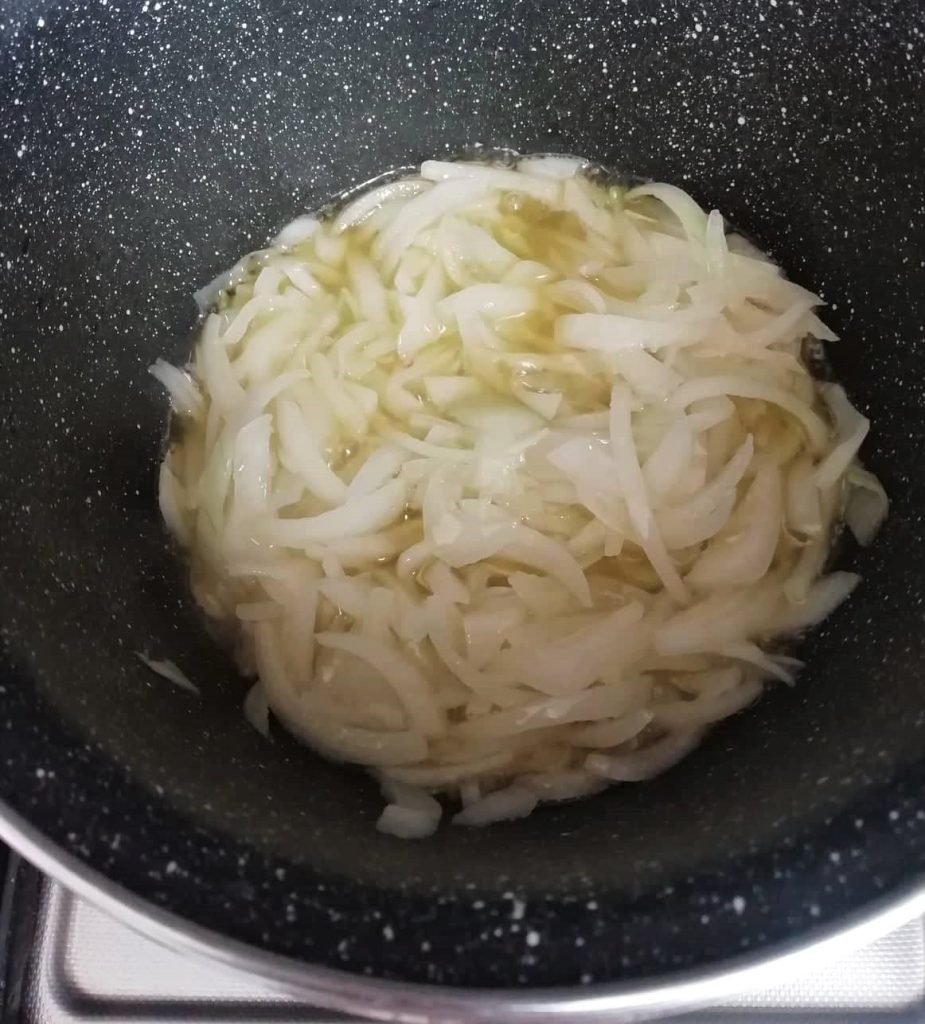 Coloque numa panela o azeite e as cebolas fatiadas finamente e deixe amolecer por alguns minutos.