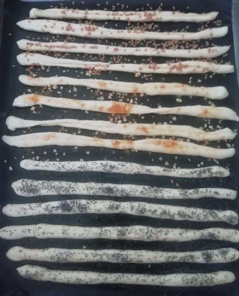 Basta preparar a massa e esticá-los na assadeira. Vamos fazê-los simples, ao óleo de oliva, e os decoraremos com sementes de gergelim, sementes de papoula e sal com cúrcuma e pimenta.