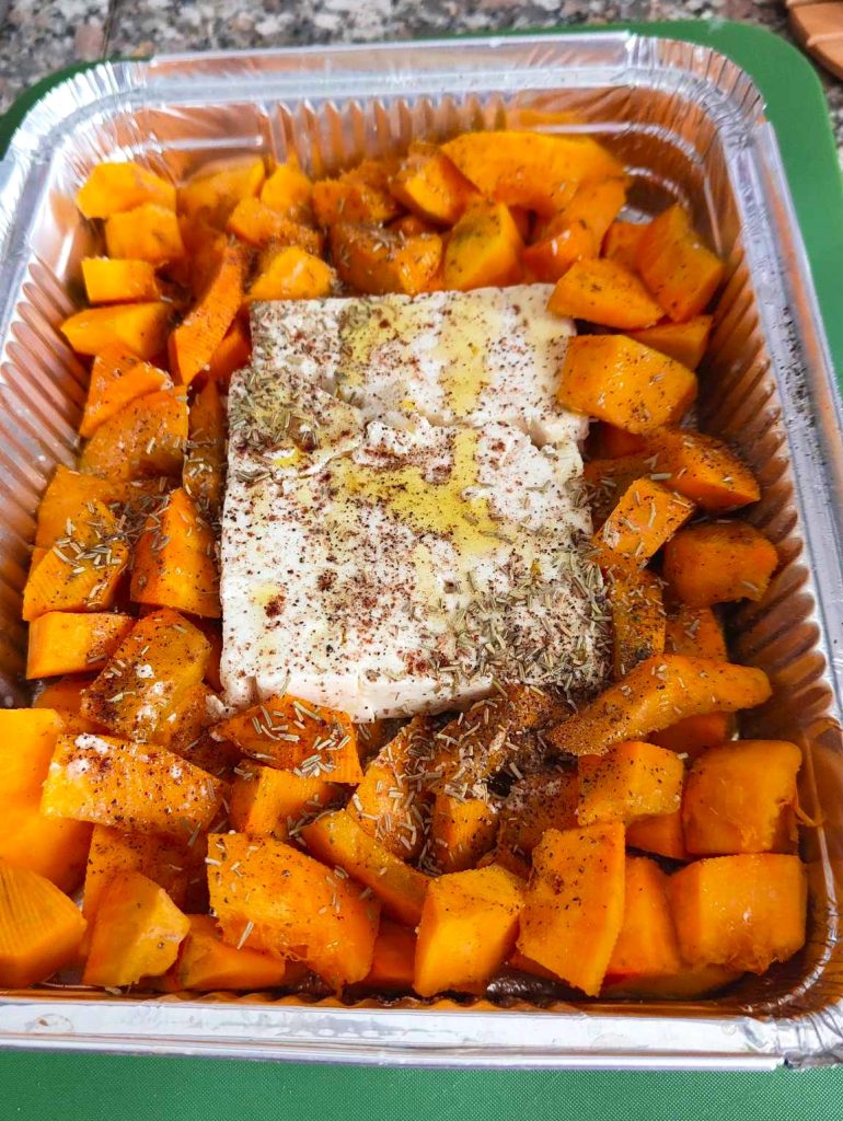 Em uma assadeira de alumínio 20×20 ou 20×15, coloque no centro a fatia de feta inteira e ao redor, em uma única camada, a abóbora cortada em pequenos cubos.