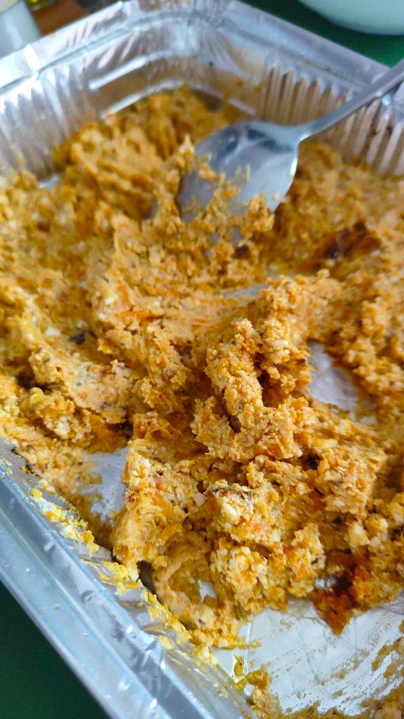 Após cozinhar a abóbora com o feta, amasse tudo com um garfo, transformando a mistura em um purê homogêneo.