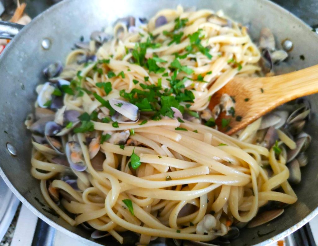 A massa com telline, seja feita com espaguete ou linguine, lembra a todos o mar da infância. Quando nos sentávamos na beira do mar e afundávamos as mãos na areia para filtrar o máximo de telline que podíamos, e depois as guardávamos em garrafas de plástico com água do mar para levá-las para casa. Belos tempos, despreocupados, com deliciosas telline colhidas para passar o tempo, hoje compradas nos balcões de peixaria evocam igualmente aquelas sensações felizes.