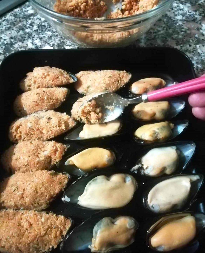 • Cubra os mexilhões com a mistura de farinha de rosca, recheie-os um a um sem sobrepor.