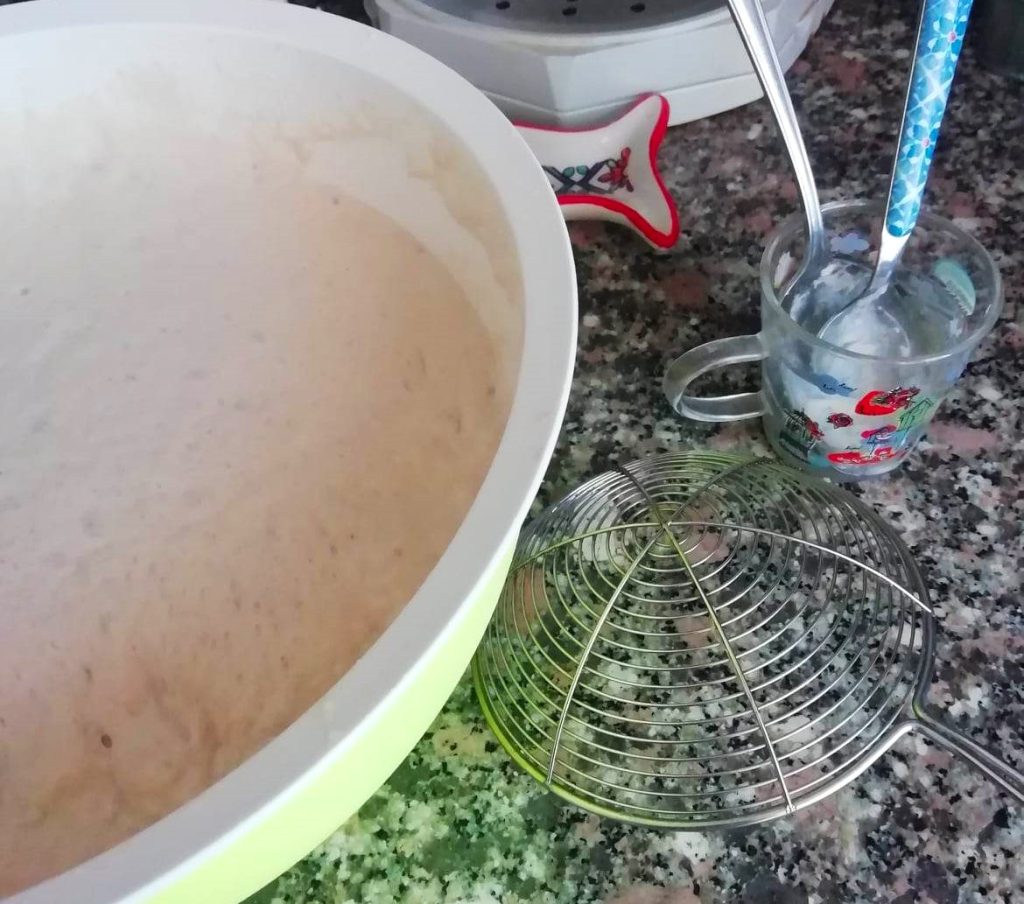 Bata a massa, com vigor, nas laterais da tigela e quando começarem a aparecer as primeiras bolhas de ar, pare e deixe-a crescer, coberta, até dobrar de tamanho.