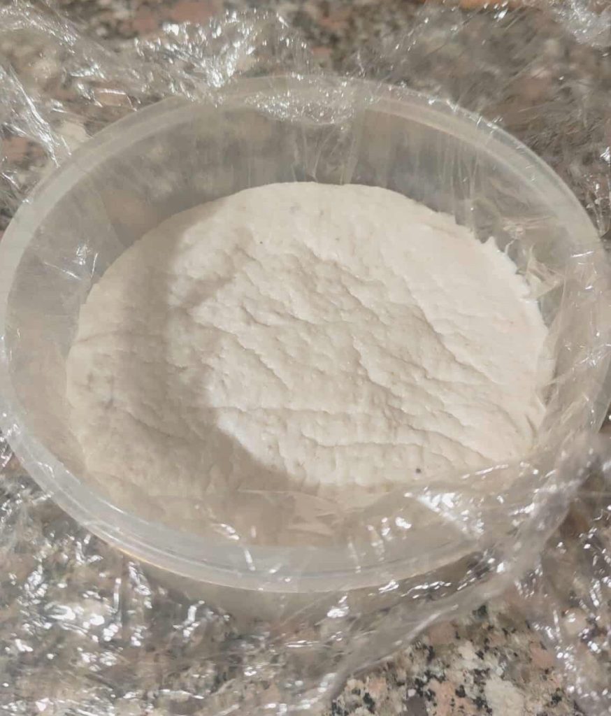 Despeje a mistura em uma forma redonda de cerca de 14 cm de diâmetro (um recipiente plástico também funciona) forrada com filme plástico.