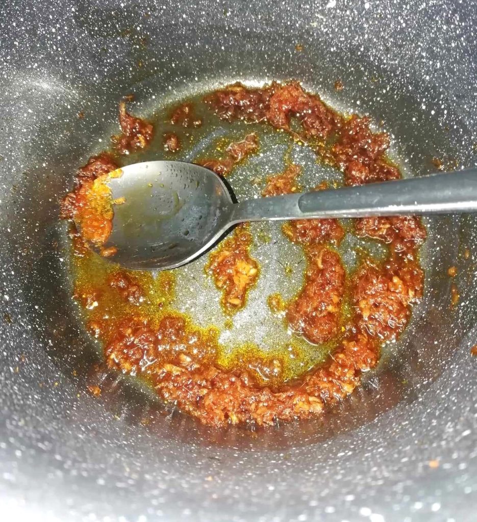 • Em uma panela coloque o óleo de gergelim, ou de sementes de girassol, com o gengibre ralado e a pasta de curry vermelho, substituível por pasta de tom yum. Acenda o fogo em chama baixa e deixe dourar por 1 minuto, mexendo com uma colher para não grudar.