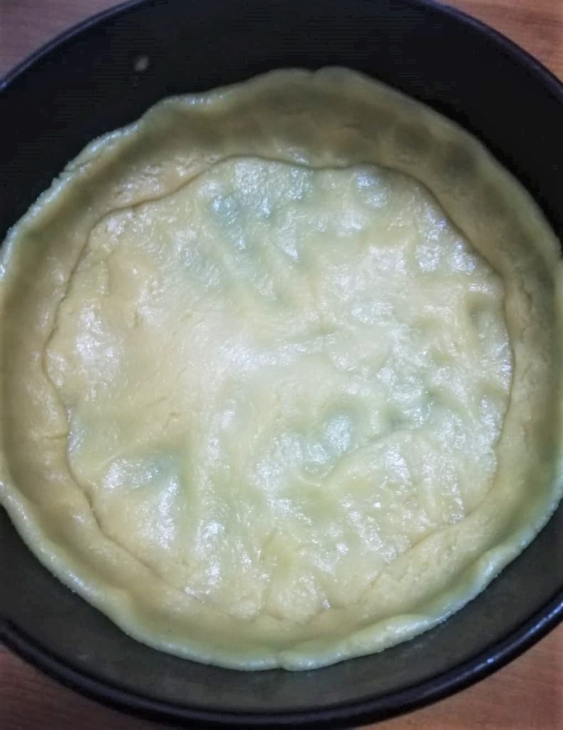Divida a massa ao meio e depois de untar e enfarinhar a forma estenda metade da massa com as mãos. Esta massa não deve ser estendida com o rolo. Para a borda, faça um cordão tubular e posicione ao redor da base da forma, depois pressione com os dedos dando uma altura de cerca de 2 centímetros.