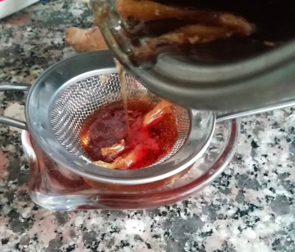 Desligue o fogo e coe o xarope ainda quente com uma peneira, para eliminar o gengibre.