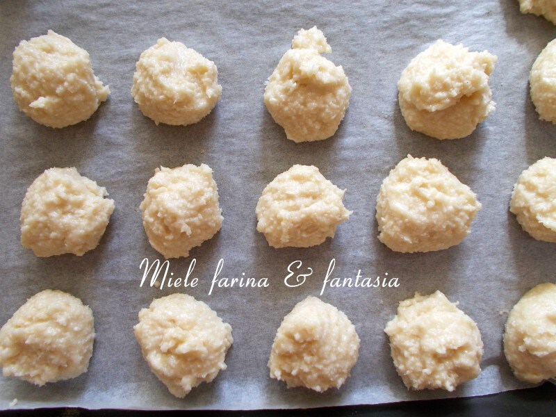 Forramos uma assadeira com papel manteiga e, ajudando-nos com duas colheres de chá, formamos nossos biscoitos, pegando uma bolinha do tamanho de uma noz (podemos também fazê-los menores, rendendo cerca de 50 biscoitos) que colocaremos na assadeira forrada.