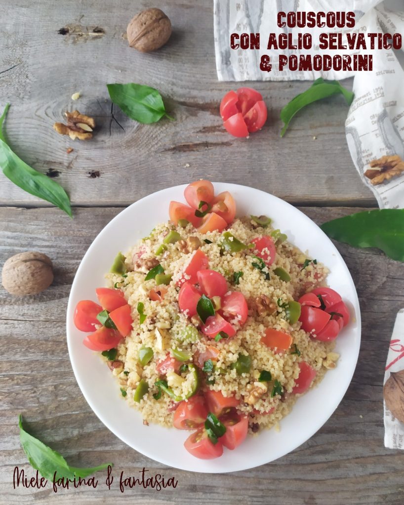 O cuscuz com alho selvagem e tomatinhos é um prato principal frio vegetariano saboroso e muito fácil, colorido e muito aromático. Pode ser preparado com antecedência e podemos levá-lo conosco para o trabalho ou no tempo livre. Esta receita deliciosa e apetitosa pode ser personalizada de tempos em tempos, adicionando salmão defumado ou em conserva, atum, cavala, ovos cozidos; ou queijo cottage, lascas de queijo, frutas secas e assim por diante.
