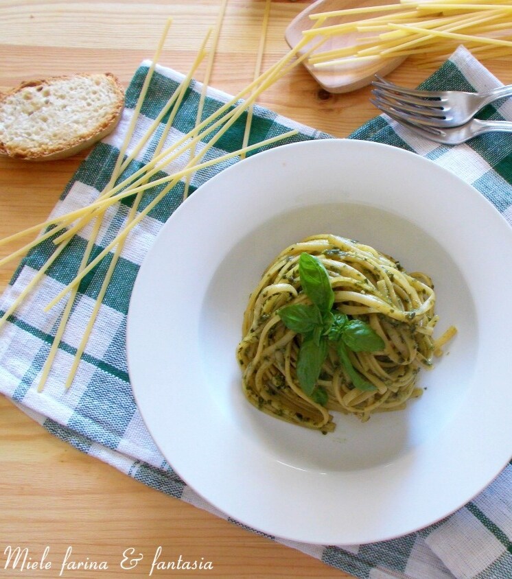 As linguine com pesto de manjericão são aromáticas, deliciosas e se preparam na hora. Trata-se de um prato principal extremamente simples de realizar, de sabor fresco, perfeito para o verão. O pesto de manjericão é feito em poucos minutos, graças ao auxílio de um mixer e de poucos ingredientes e pode ser personalizado, se necessário, com o que gostamos; podemos enriquecê-lo com nozes, avelãs, pinhões ou filés de anchova.