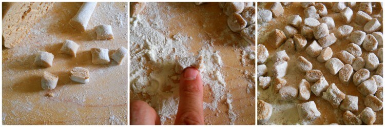 Formamos os nhoques. Enfarinhamos a superfície de trabalho e separamos pedaços – mais ou menos do mesmo peso – da massa, enfarinhamos levemente e formamos cilindros de cerca de 20 centímetros de comprimento; trabalhamos delicadamente com as palmas das mãos, sem apertar. Dos cilindros cortamos pequenos nhoques (nas fotos os nhoques são do tamanho de uma avelã) que enfarinhamos e enrolamos com a ponta dos dedos, do lado do corte, usando sempre muita delicadeza.