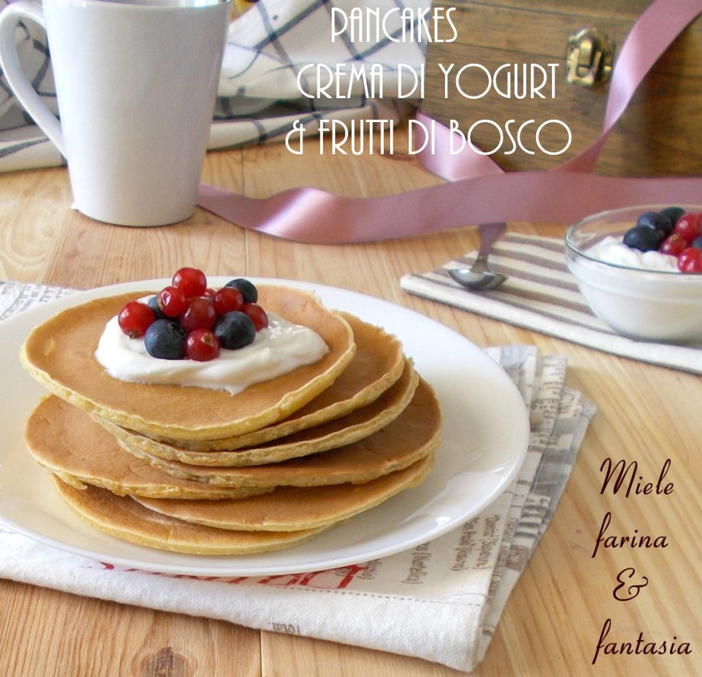 Para o café da manhã ou lanche, não há nada melhor que um docinho saboroso e fresco ao mesmo tempo. Assim como estas panquecas acompanhadas de um delicioso creme de iogurte grego e frutas vermelhas. As panquecas propostas por mim nesta receita são uma versão mais leve porque não contêm manteiga, muito rápida e simplificada, em comparação à original, levando em conta que na Itália não é fácil encontrar o buttermilk, um dos ingredientes fundamentais para sua preparação (que, no entanto, pode ser feito em casa facilmente). Podemos prepará-las até mesmo para um aniversário, um almoço importante ou para convidados inesperados. Sugiro o uso de um iogurte espesso, como o grego, para obter um creme firme que não escorregue das panquecas. Em geral, recomenda-se comer as panquecas imediatamente, mas eu as acho boas também frias.