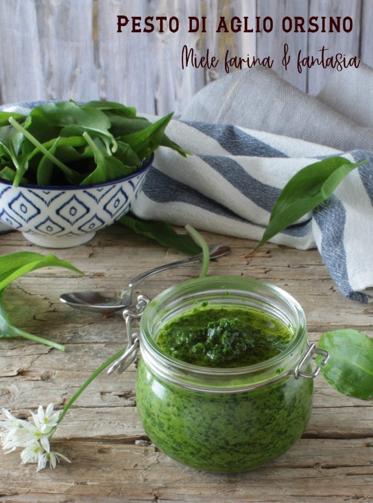 O pesto de alho selvagem é um creme muito perfumado, muito saboroso, fácil e rápido de fazer, ideal para acompanhar pratos à base de carne ou peixe, tanto assados como fritos, e para temperar massas. O alho selvagem é uma planta aromática comestível que cresce espontaneamente nas florestas e em locais úmidos, de março a junho (mas é possível cultivá-lo em vasos nas varandas, comprando as mudas ou sementes em lojas especializadas) e é o parente selvagem do alho comum. Tem um sabor mais delicado que lembra a cebolinha e é mais digerível do que o alho comum. Todas as suas partes são comestíveis: caule, folhas, bulbos, flores, para usar na preparação de decocções, chás, óleos aromatizados ou para temperar queijos, tortas salgadas, saladas, omeletes, massas, arroz e assim por diante. O alho selvagem é uma planta muito versátil, não apenas na culinária. Possui, de fato, numerosas propriedades benéficas para o nosso organismo, incluindo ação antifúngica, antisséptica, antioxidante, diurética, etc…