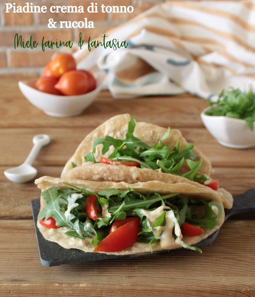 As piadinas com rúcula e molho de atum são uma verdadeira delícia para preparar para um buffet (reduzindo o tamanho das piadinas ou dividindo-as ao meio), para o almoço, jantar, nas férias, ou para uma noite com amigos. Elas pertencem à categoria finger food (ou seja, comida que pode ser facilmente comida com as mãos) e são úteis quando não queremos ligar o fogão ou está muito quente para fazê-lo. As piadinas com rúcula e molho de atum são muito fáceis, versáteis e podem ser preparadas em poucos minutos, a menos que decidamos fazer as piadinas nós mesmos; algo que, no entanto, pode ser feito com bastante antecedência, como eu costumo fazer. Se desejarmos, podemos usar piadinas já prontas do mercado, ou prepará-las com as nossas mãos (no blog você encontrará vários tipos de piadinas, feitas sem glúten, com e sem gorduras e com diferentes tipos de farinha). Esta receita pode ser personalizada adicionando também frios, cenouras, pepinos fatiados bem fininhos.