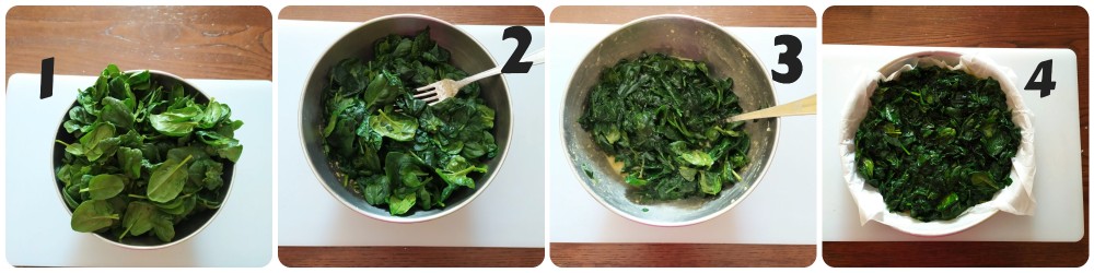 Transfira-as para uma panela grande que possa conter todas as folhas e deixe murchar por apenas 5 minutos, mexendo de vez em quando, em fogo médio, sem água e sem sal. Transfira-as, em seguida, para uma tigela.
