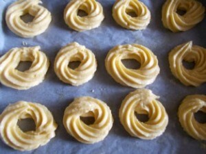 4) Enchemos um saco de confeitar com bico em forma de estrela e criamos rosquinhas com cerca de 5 cm. de diâmetro ou maiores, se preferirmos; espaçamos um dedo uma da outra.