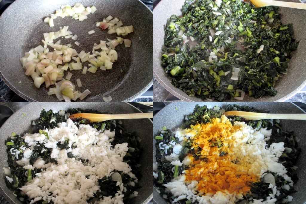 Em uma caçarola antiaderente, aqueça uma colher de chá de óleo e frite as cebolinas picadas. Quando estiverem levemente douradas, adicione a couve, um pouco de sal e misture bem. Deixe no fogo por alguns minutos e depois adicione o arroz cozido. Adicione a cúrcuma e misture para incorporar bem: o arroz ficará com uma bela cor amarela.