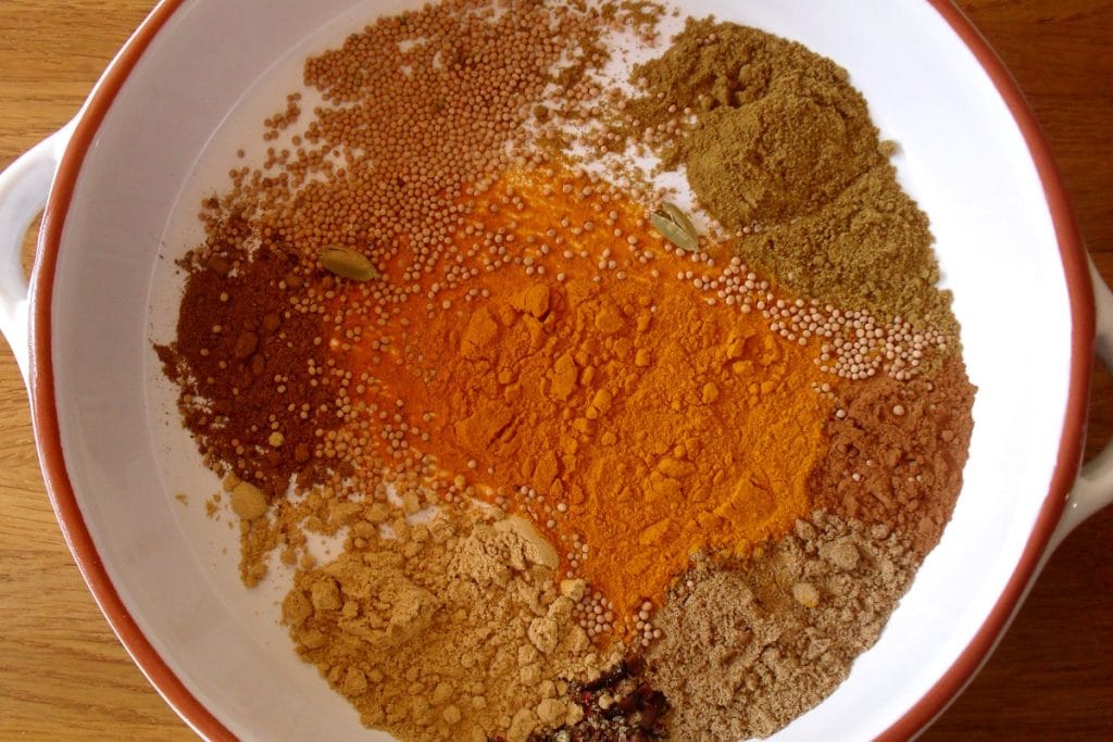 A receita tradicional prevê tostar as especiarias por 5-10 minutos, até que as especiarias fiquem ligeiramente escuras e o aroma que liberam seja intenso e fragrante. Se quiser, pode fazer assim, mas eu prefiro preparar todas as especiarias cruas e tostar a quantidade que preciso quando preparo o prato.