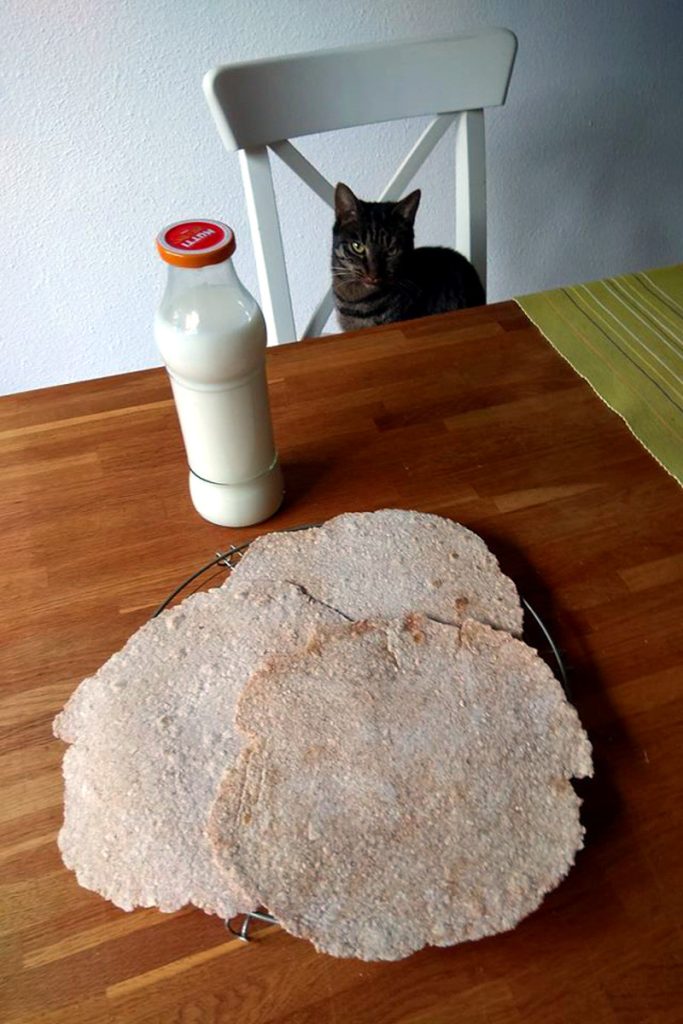 • Na segunda foto você vê outro exemplo de uso da okara que eu fiz há um tempo, uma espécie de tortilha que ficou, aliás, ótima.