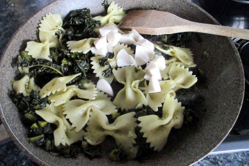 Enquanto isso, cozinhe o macarrão na água da couve negra adicionando mais se necessário. Escorra o macarrão, coloque na frigideira com a couve negra e misture. Adicione também o queijo vegano em pedaços e mexa para que derreta um pouco.