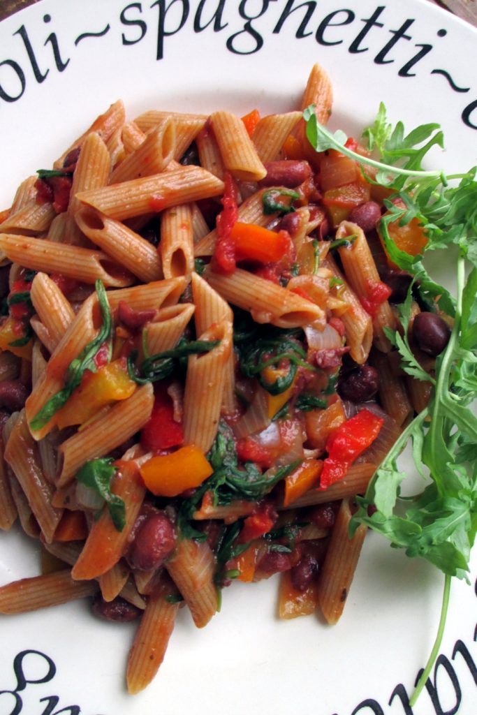 Como é boa a massa à mexicana! Não há uma razão particular para chamá-la assim, exceto pelo fato de a receita do molho ser muito similar à do Chili com carne. Na verdade, quase todos os ingredientes estão presentes: feijões mexicanos, pimentões, especiarias. Falta a carne moída, principalmente porque esta receita é vegana, e também porque adicionar soja texturizada teria sido realmente adicionar um pouco de proteína demais na minha opinião…
