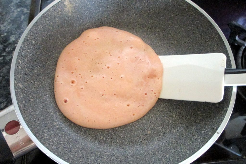 Quando você perceber que a superfície da panqueca de lentilha começa a secar, experimente com muita delicadeza ver se consegue descolar a panqueca com a espátula.