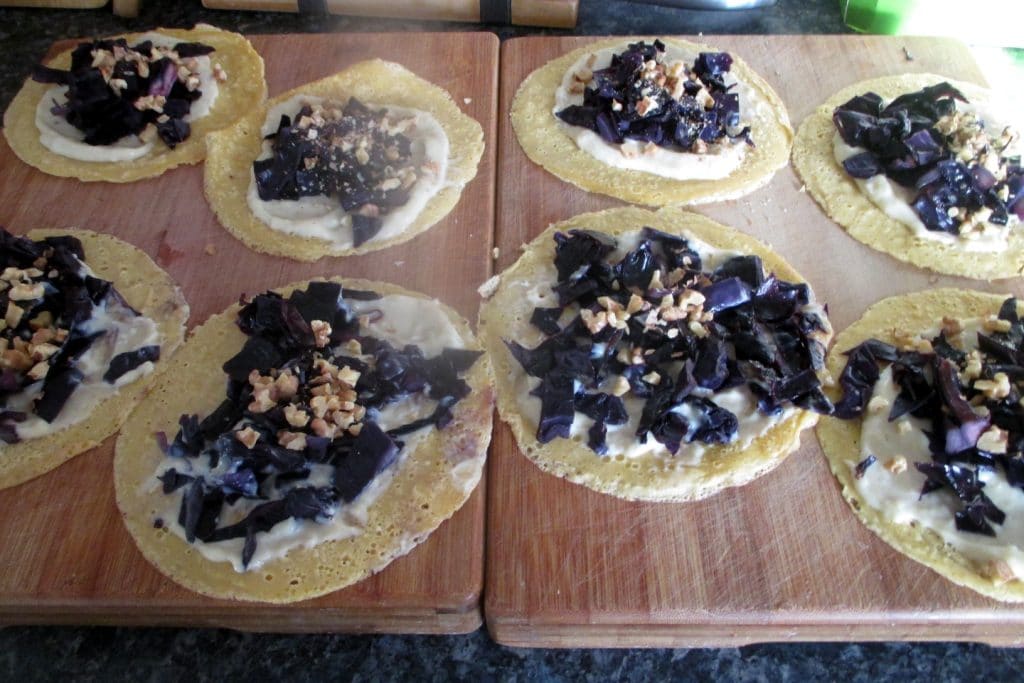 Distribua o repolho roxo e depois as nozes em todas as crepes, reservando a maior parte do molho branco e alguns pedaços de nozes para o próximo passo.