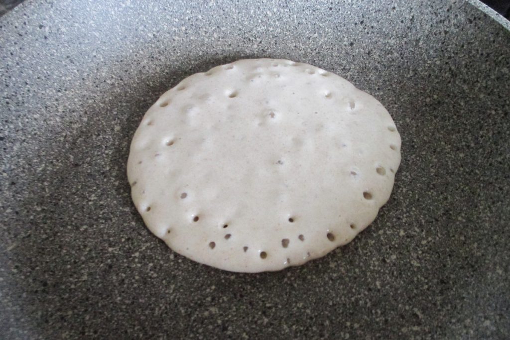 Deixe a massa descansar enquanto a frigideira antiaderente esquenta: é melhor usar uma frigideira de pedra ou pelo menos antiaderente assim não será necessário nem um fio de óleo. Eu uso uma frigideira de 20 cm, deixei uma dica na seção Ferramentas acima. Se você não tiver uma frigideira adequada, use a melhor que tiver, meça meia colher de chá de óleo à parte e pincele antes de despejar a massa. Geralmente as duas primeiras panquecas são problemáticas, depois não grudam mais.