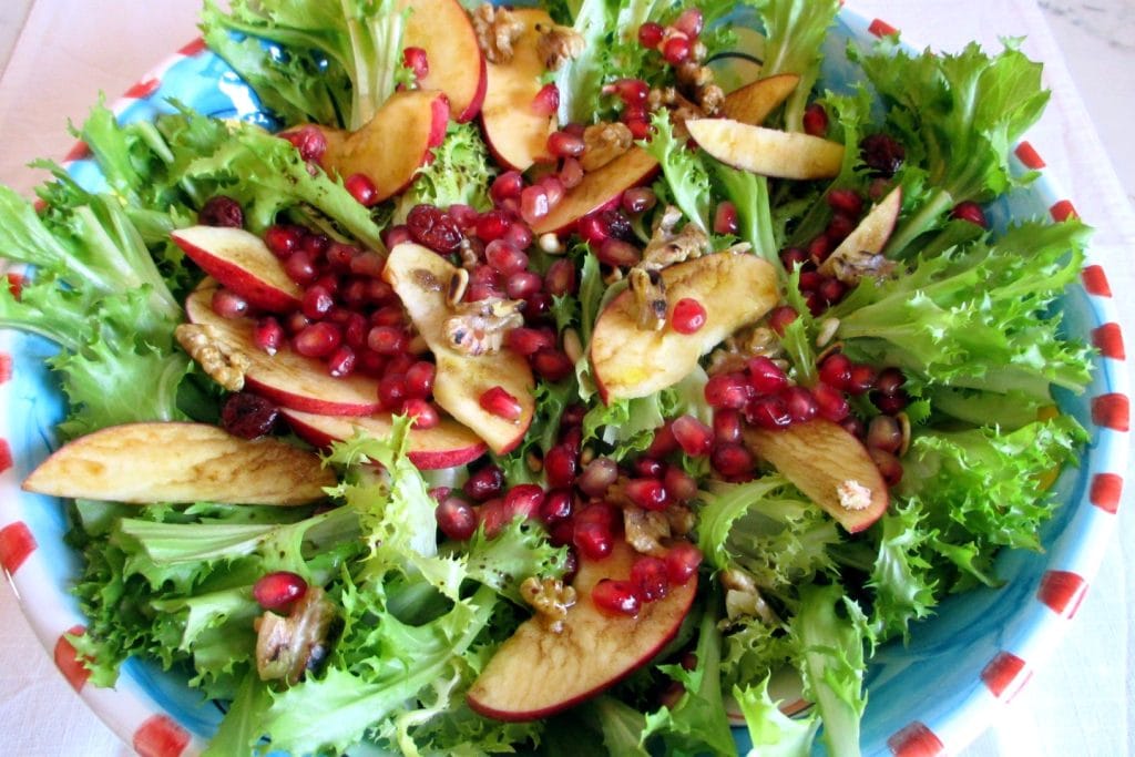 Está pronta esta linda salada de escarola crespa com frutas e nozes: cheia de cor e sabor. Nós gostamos muito e eu especialmente porque, além de ser deliciosa, tem bastante para mastigar e por isso leva tempo para terminar! É bem satisfatória e recomendo, além de como acompanhamento, como entrada. Faça e me diga se você gostou…