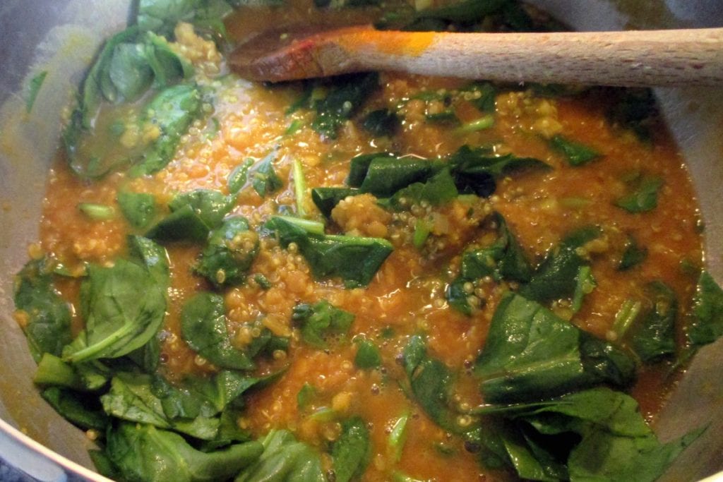 Com o outono trazendo chuva e frio aqui na Holanda, alguns dias atrás eu estava com vontade de comer um prato quente com lentilhas vermelhas e acabei preparando esta sopa de lentilhas, espinafre e quinoa, perfeita também para quem segue uma alimentação vegana e para quem é intolerante ao glúten. Também quis dar a esta sopa um sabor oriental, embora cada um possa usar as especiarias que preferir.
