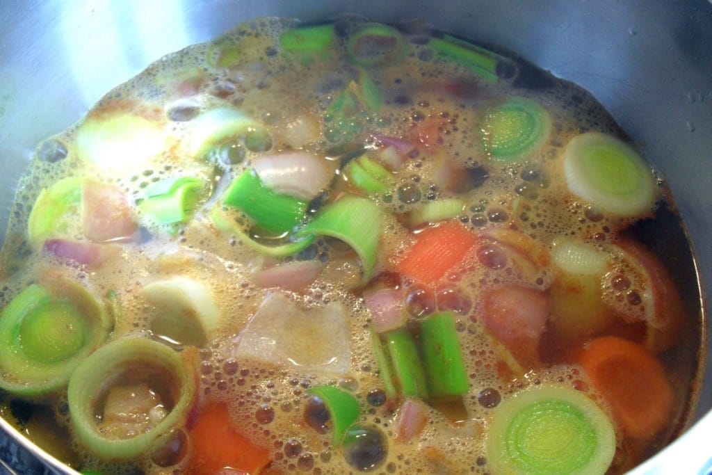 • Coloque os legumes em uma panela grande e adicione as especiarias. Adicione água até cobrir quase totalmente os legumes, mas sem imergi-los completamente.
